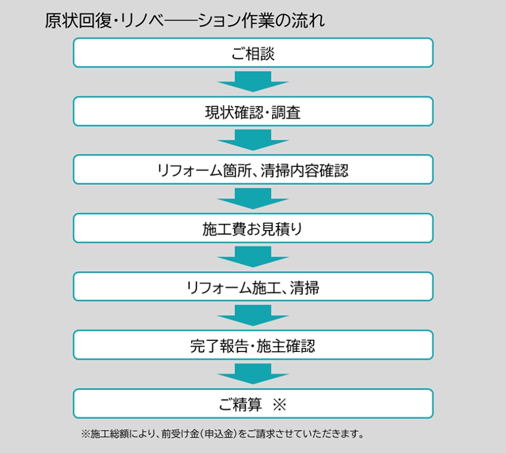 不動産会社様、家主様と実施内容、費用、お支払い関する承認をいただきましたら、速やかにスケジュール調整を行い施工にあたります。施工が完了しましたら速やかにご報告いたします。
