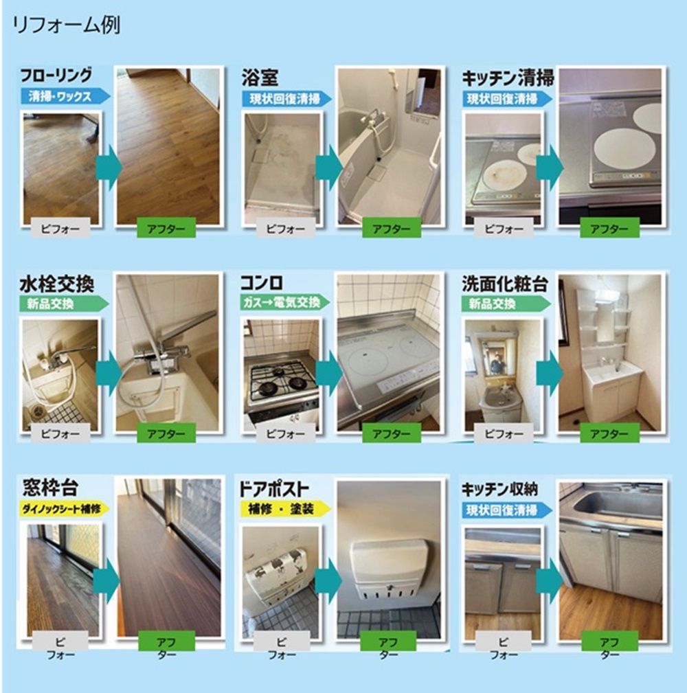 床・壁・天井などの内装、キッチン、バス、トイレ、電気など、これまで個別に対応されていたリフォームや補修・入れ替えをワンストップで承ります。これにより、不動産会社様や管理会社様の負担を軽減し原状回復の関連サービスを円滑に提供いたします。